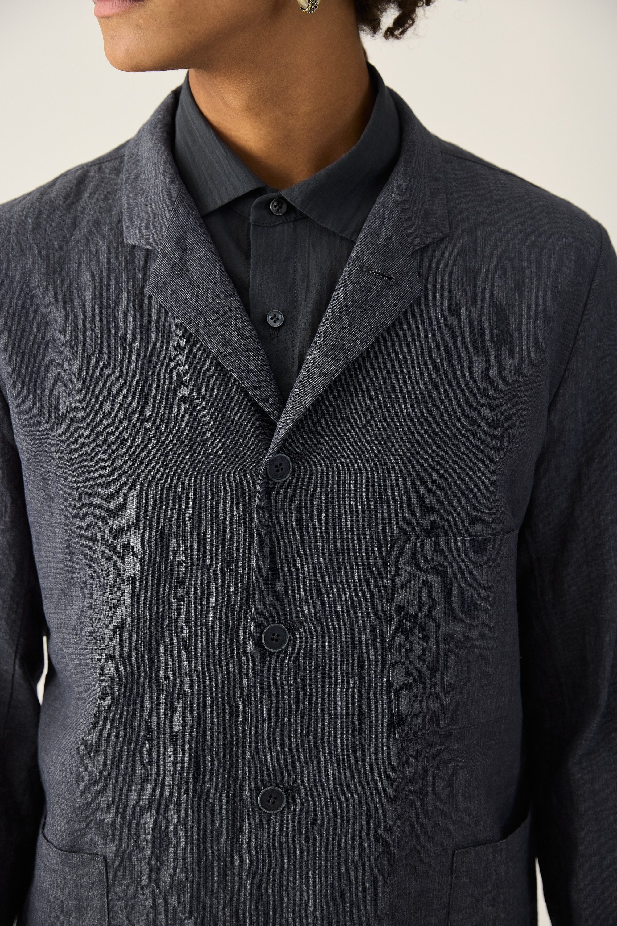 Regulär geschnittene halbgefütterte Jacke mit 3 aufgesetzten Taschen und Hybrid-Kragen.