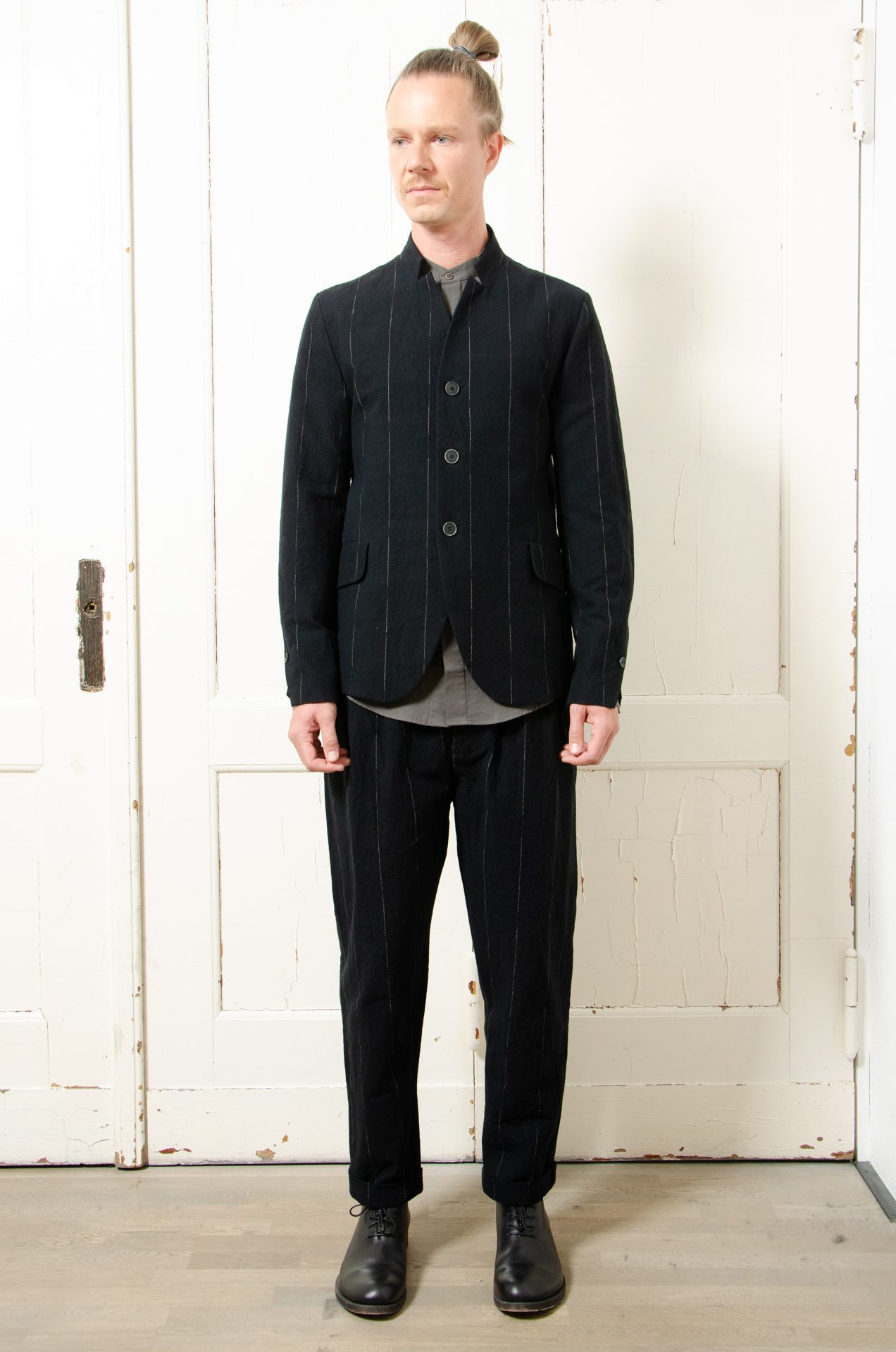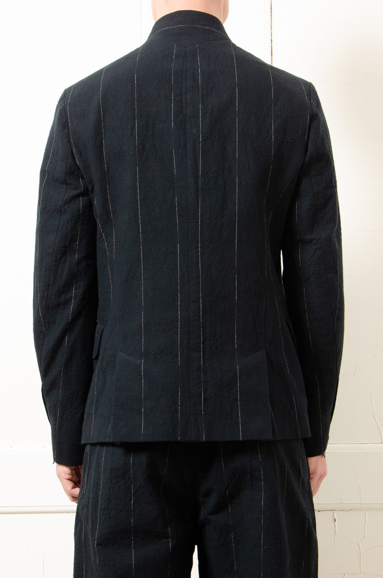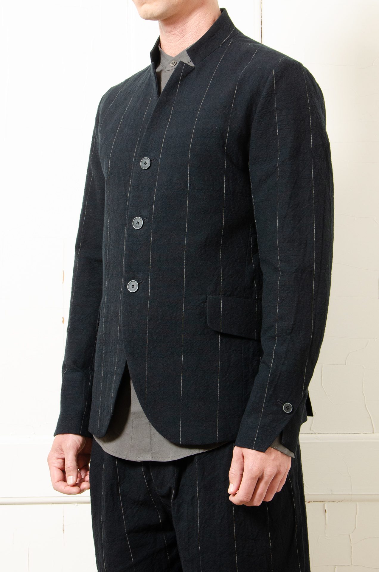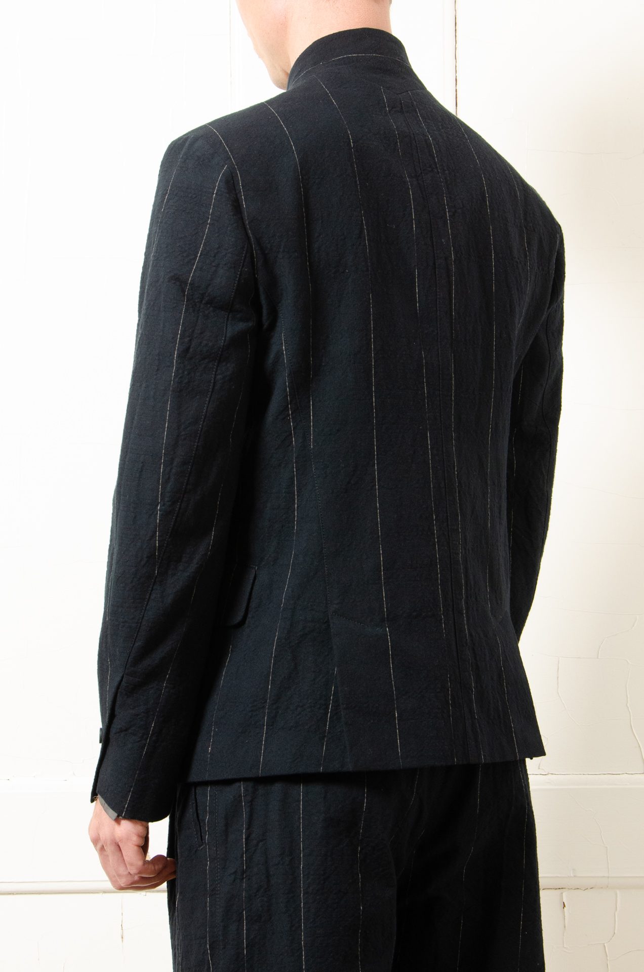 baumwoll-sakko mit stehkragen und feinen streifen.