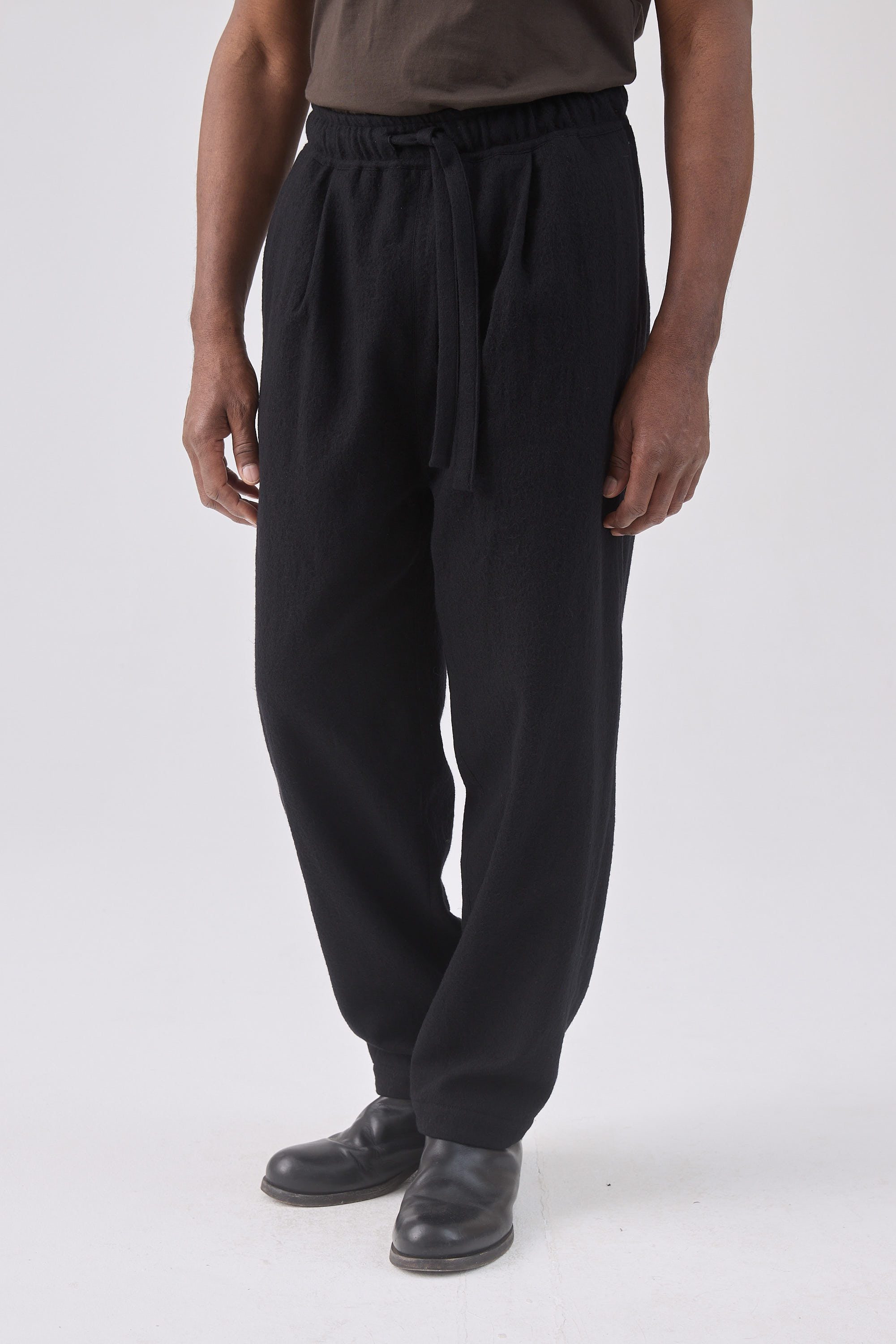 Relaxed fit drawstring trousers, made of a Japanese wool cotton blend