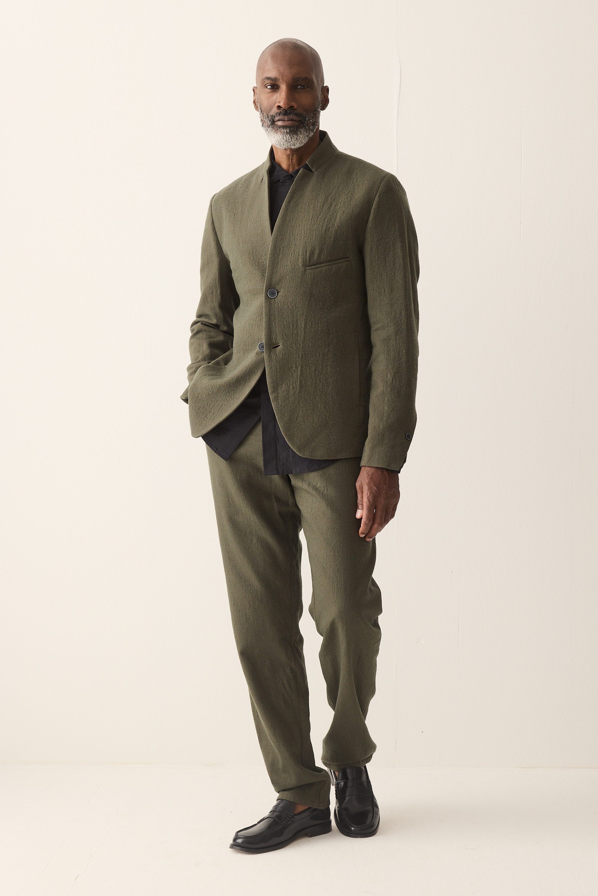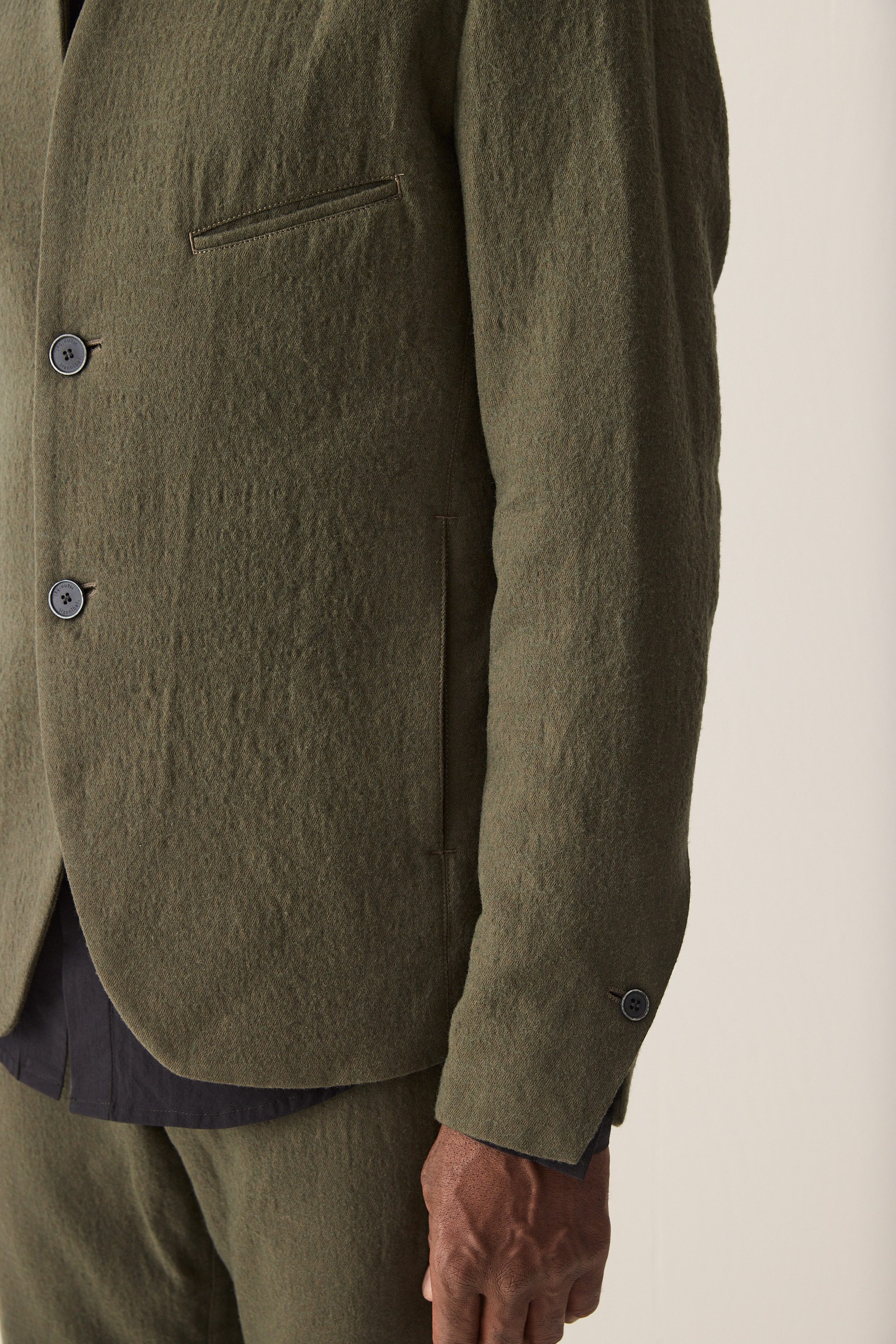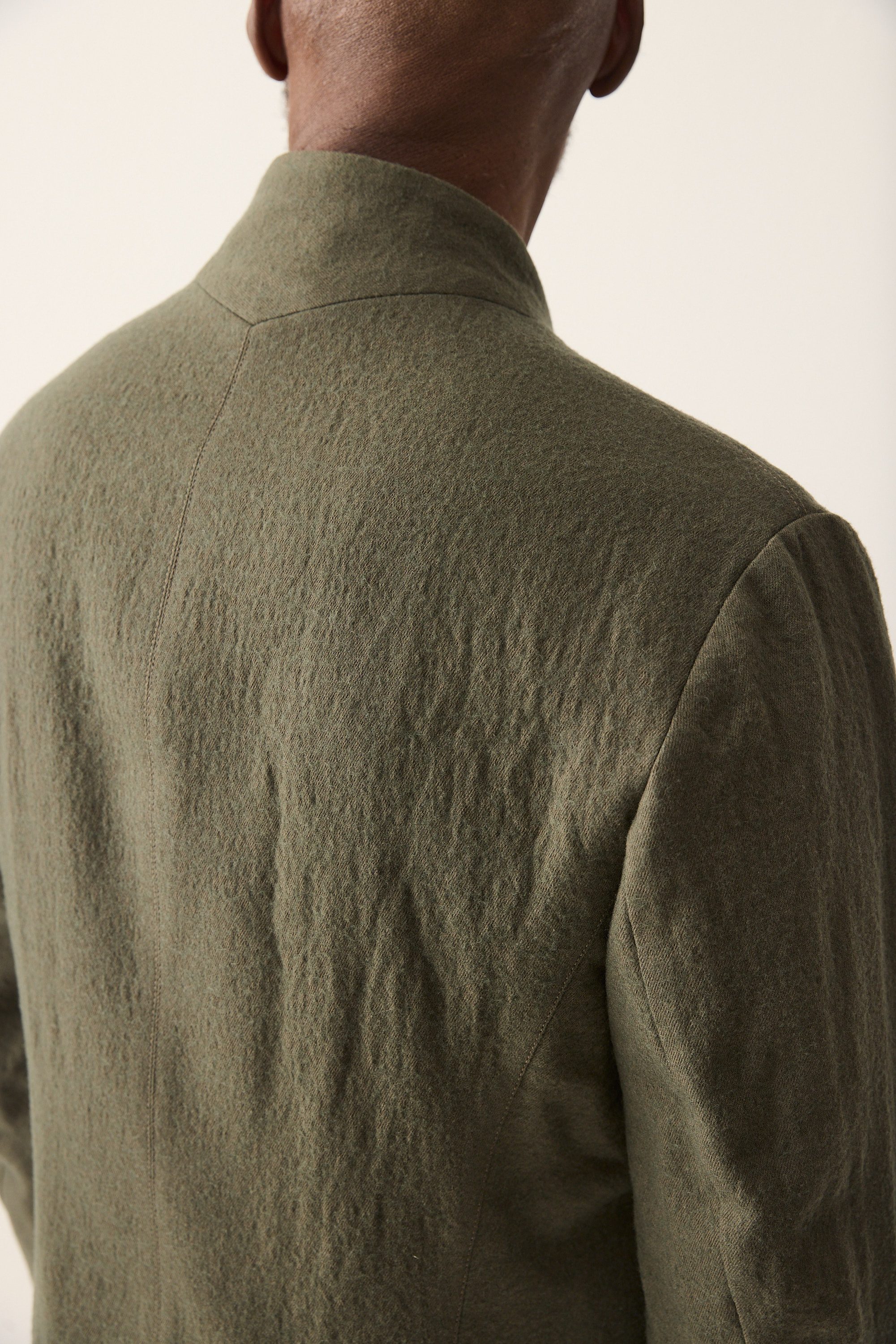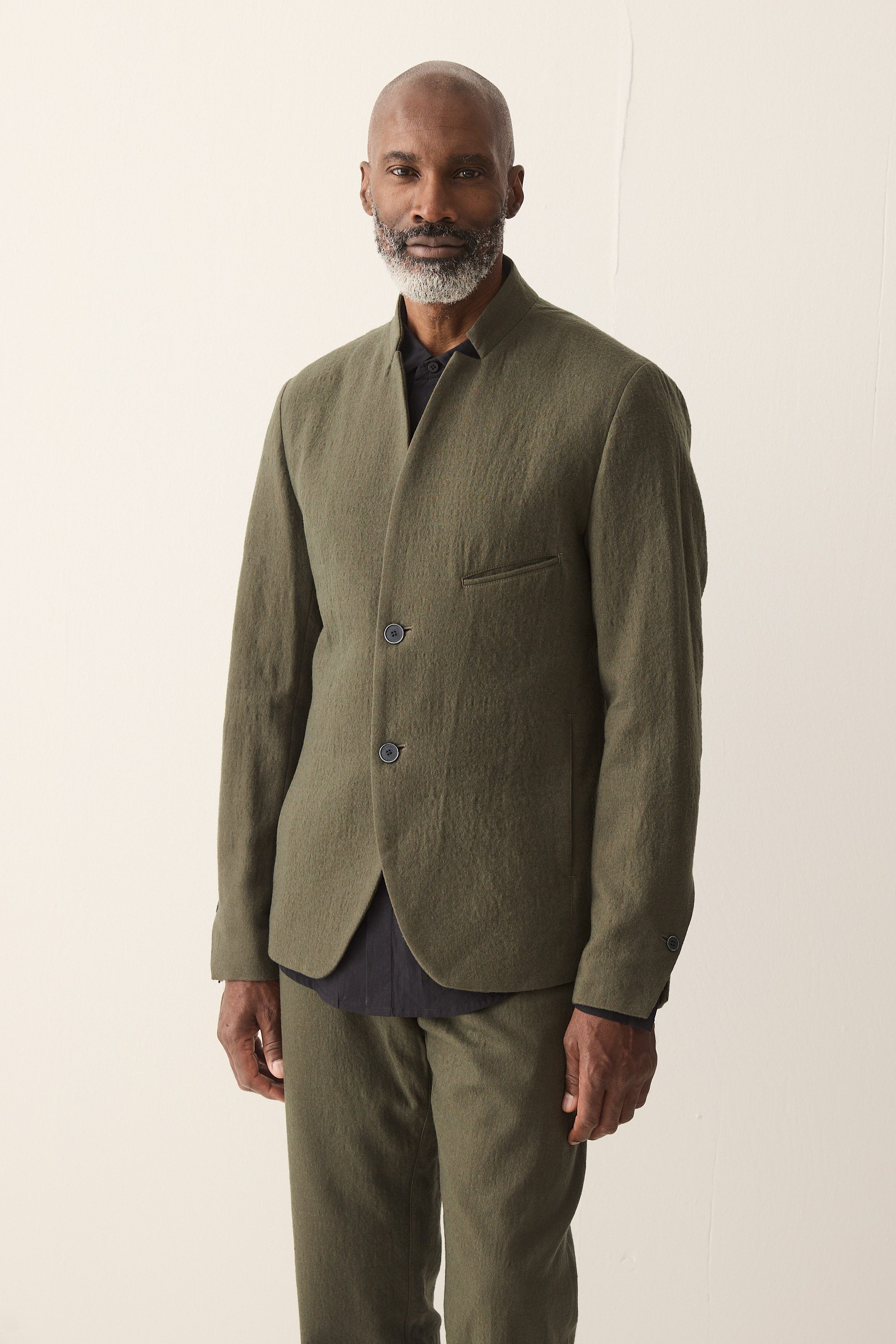 Lapel-less blazer with small stand-up collar, made from a Japanese wool cotton blend