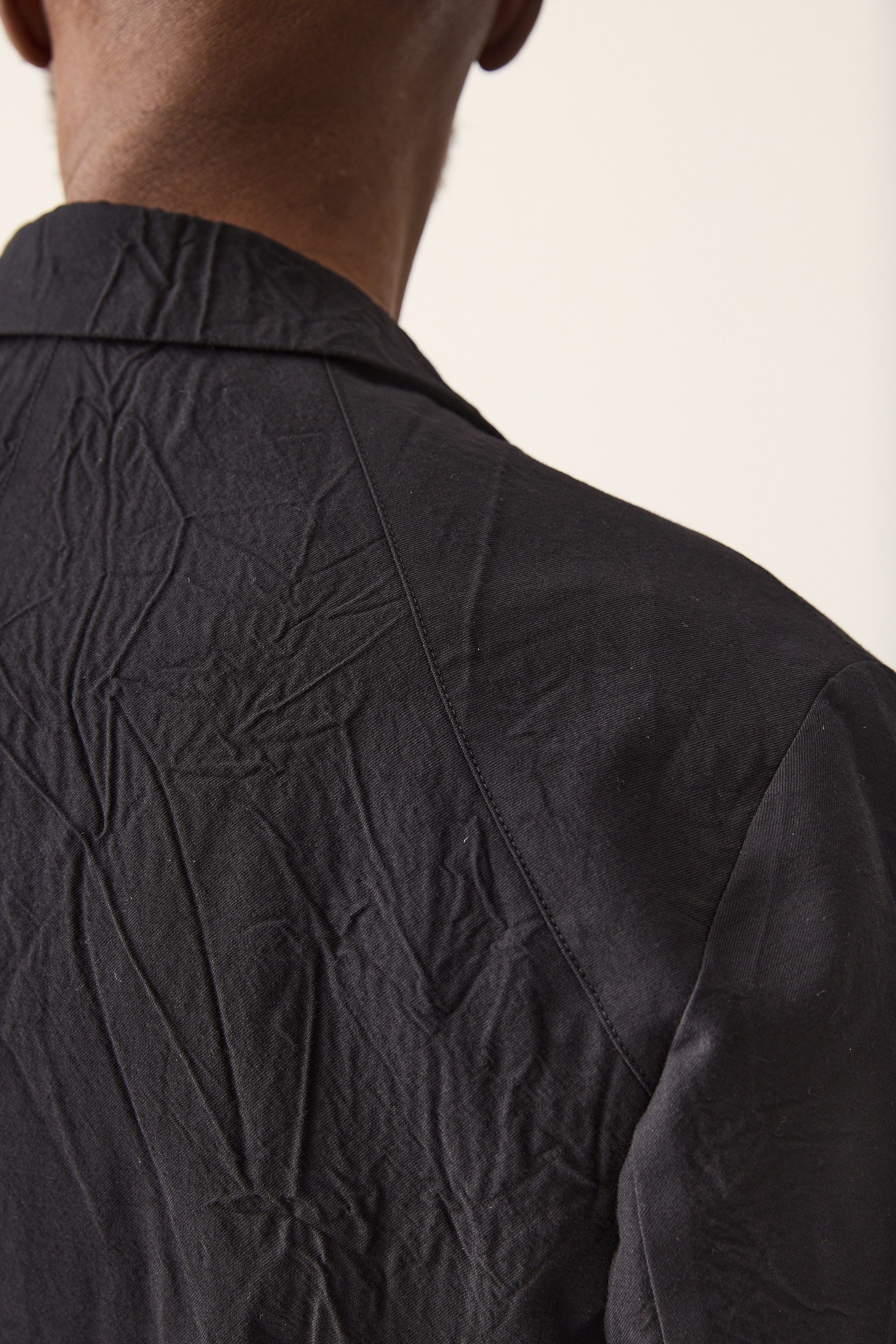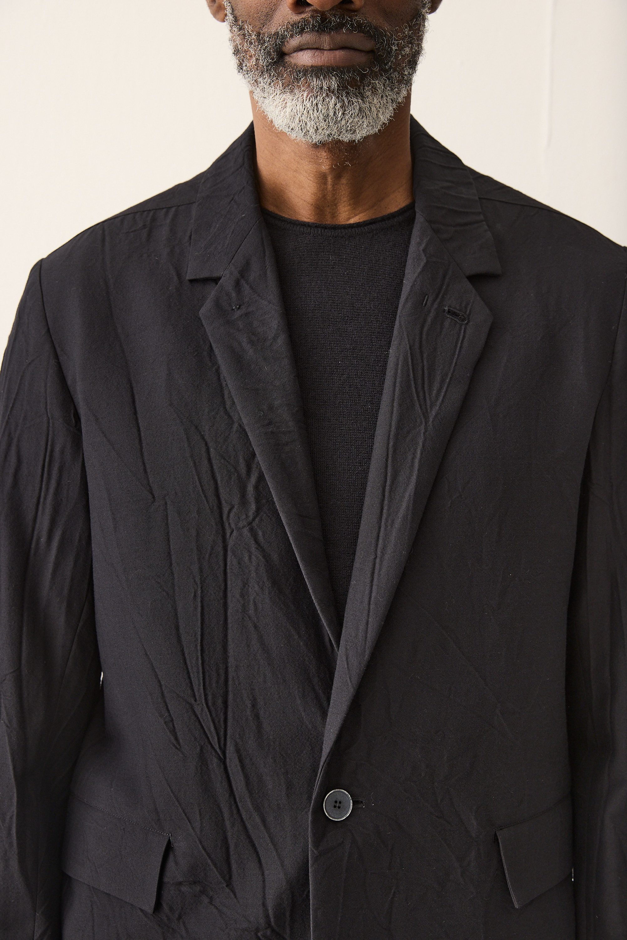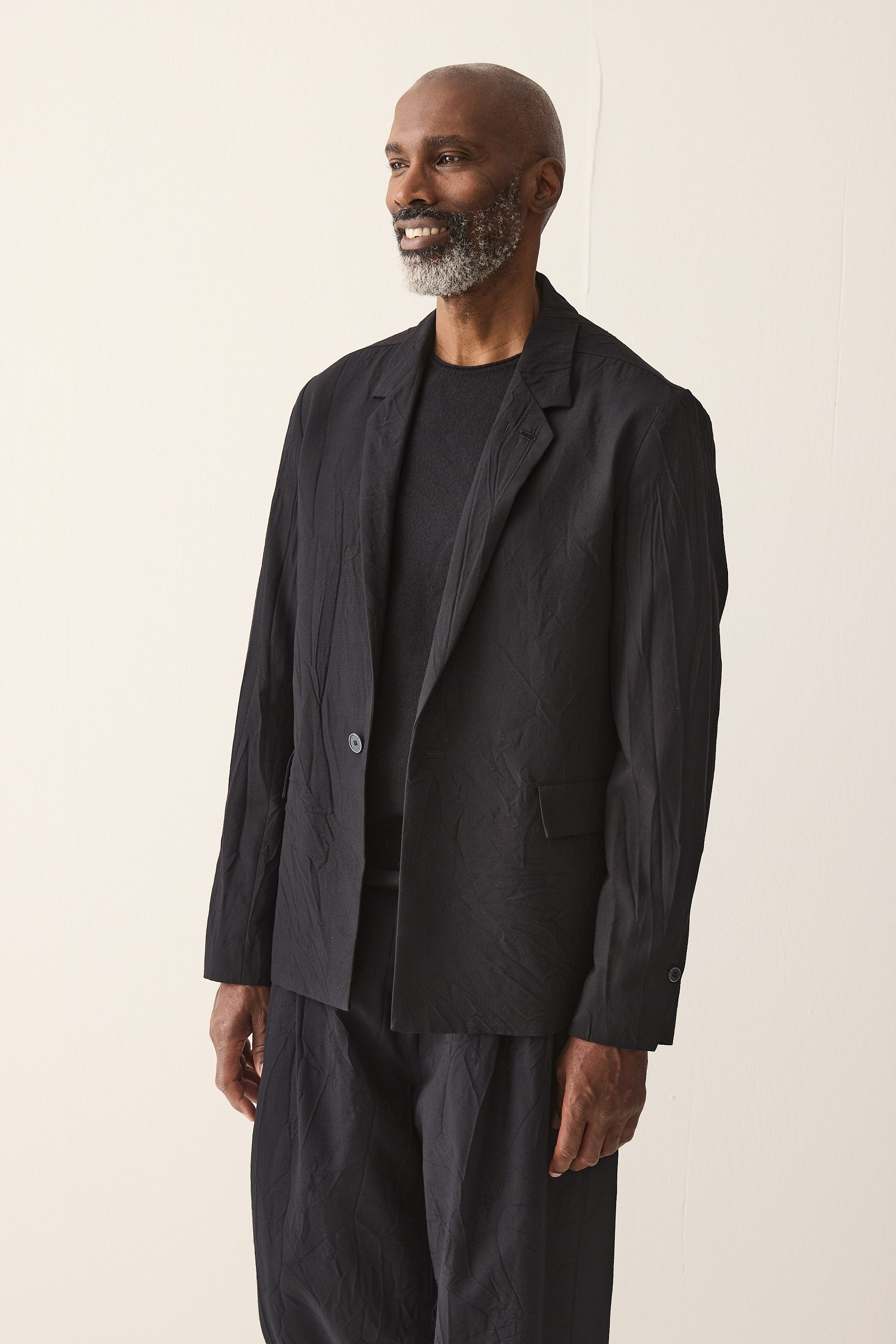 Loose-fitting blazer with a regular small collar and single-button closure made from a special Italian wool-cotton blend with a crinkle look.