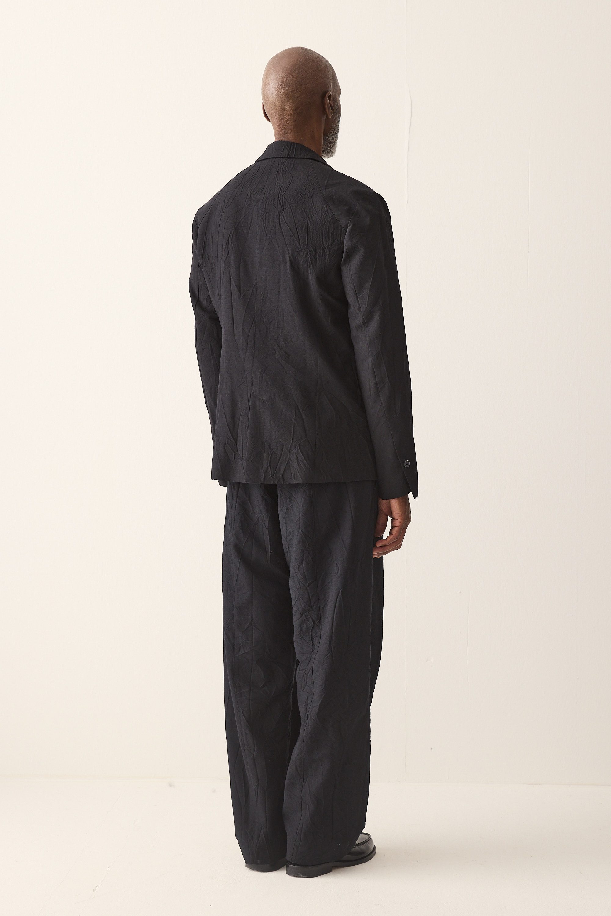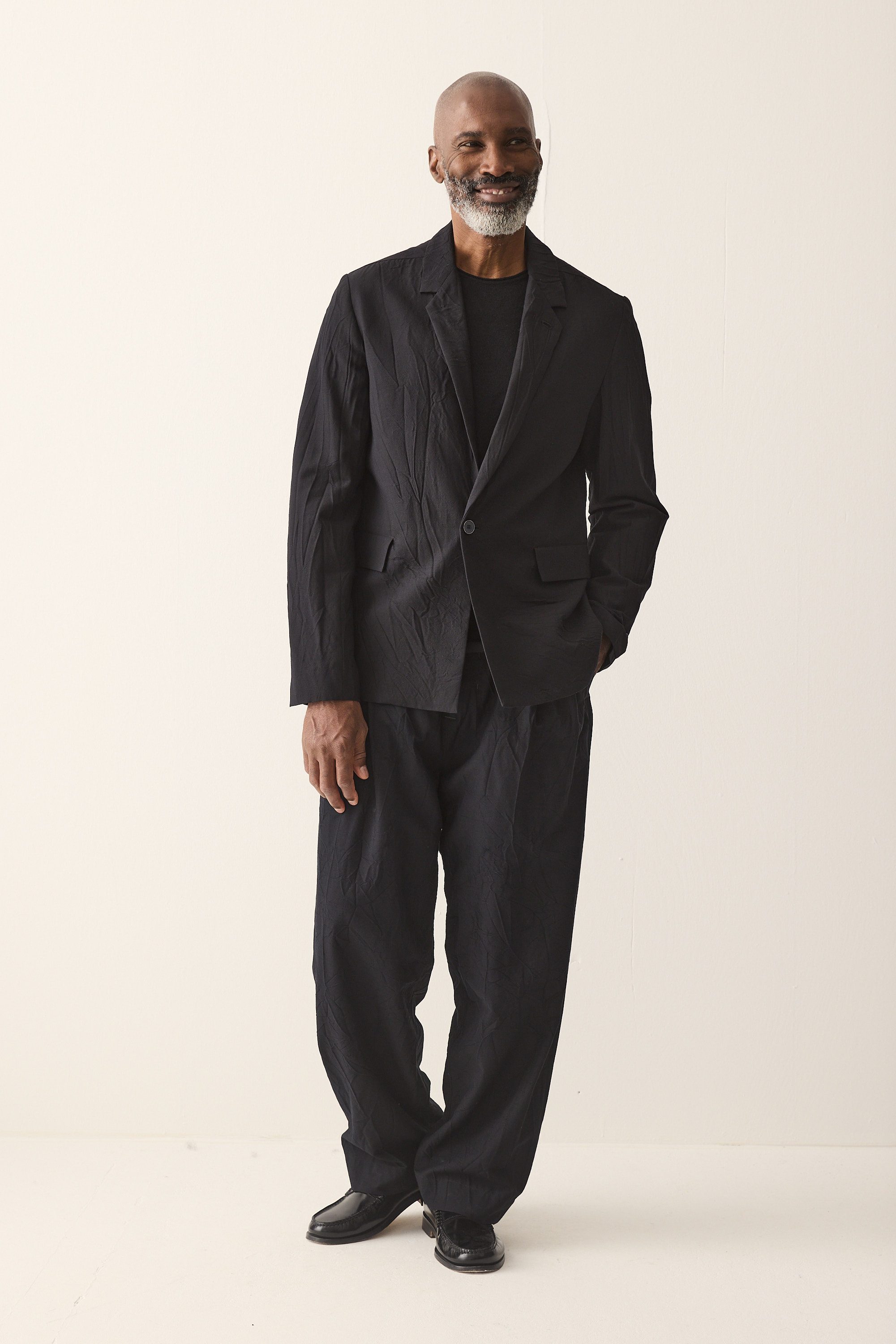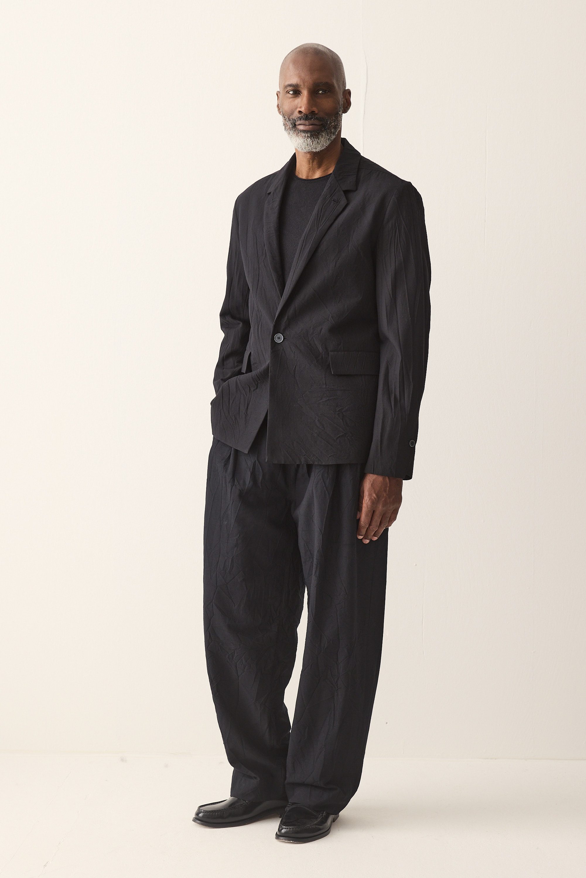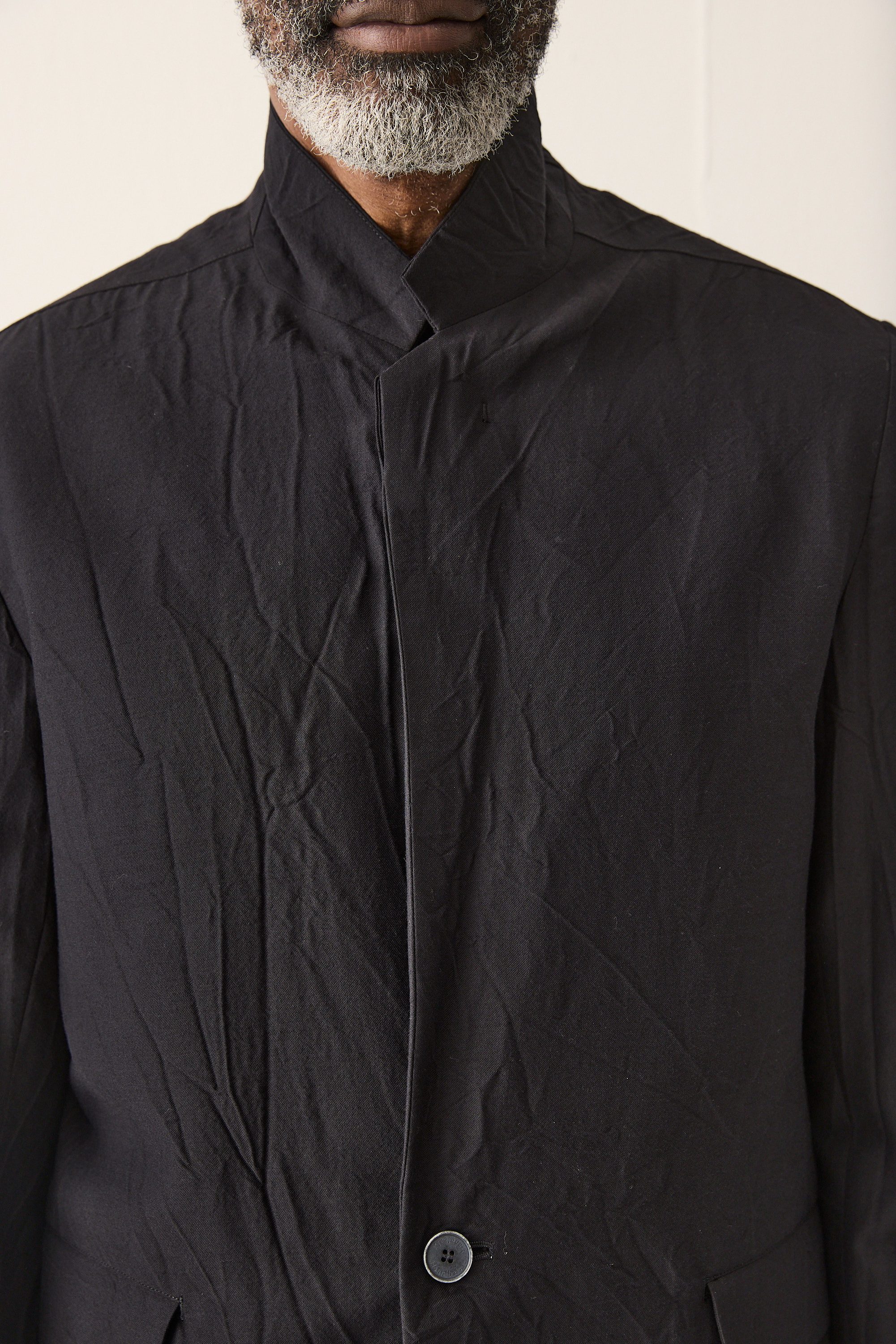 Loose-fitting blazer with a regular small collar and single-button closure made from a special Italian wool-cotton blend with a crinkle look.
