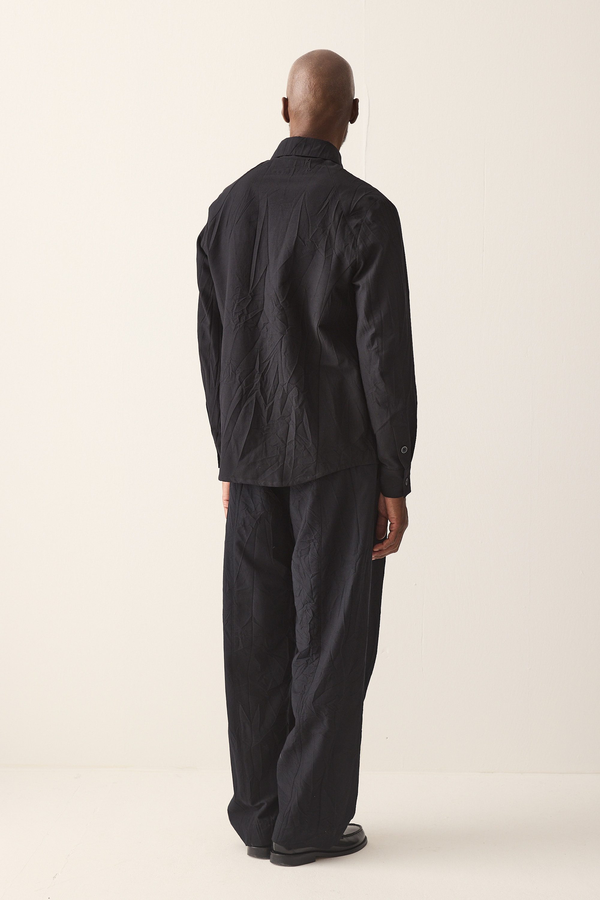 Relaxed fit overshirt with patch pockets, made of a special Italian wool-cotton blend with a crinkle look.