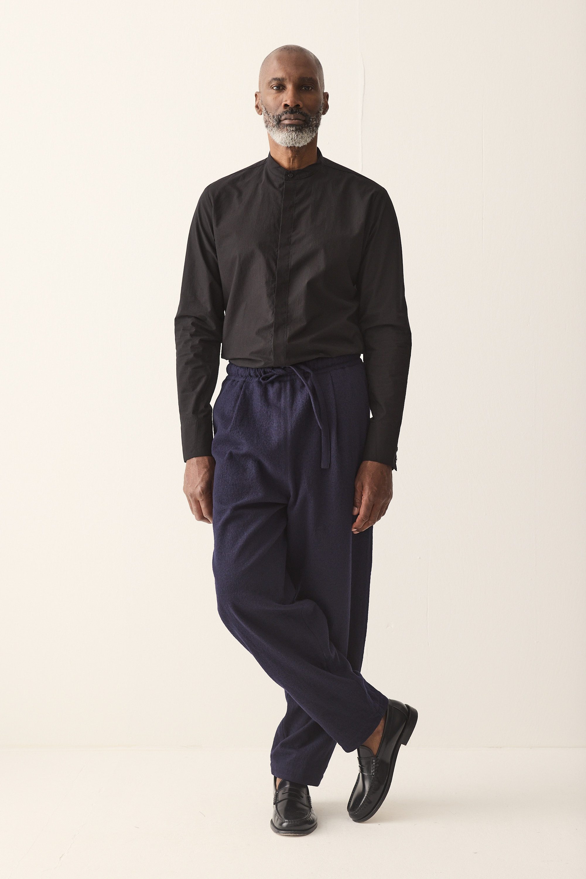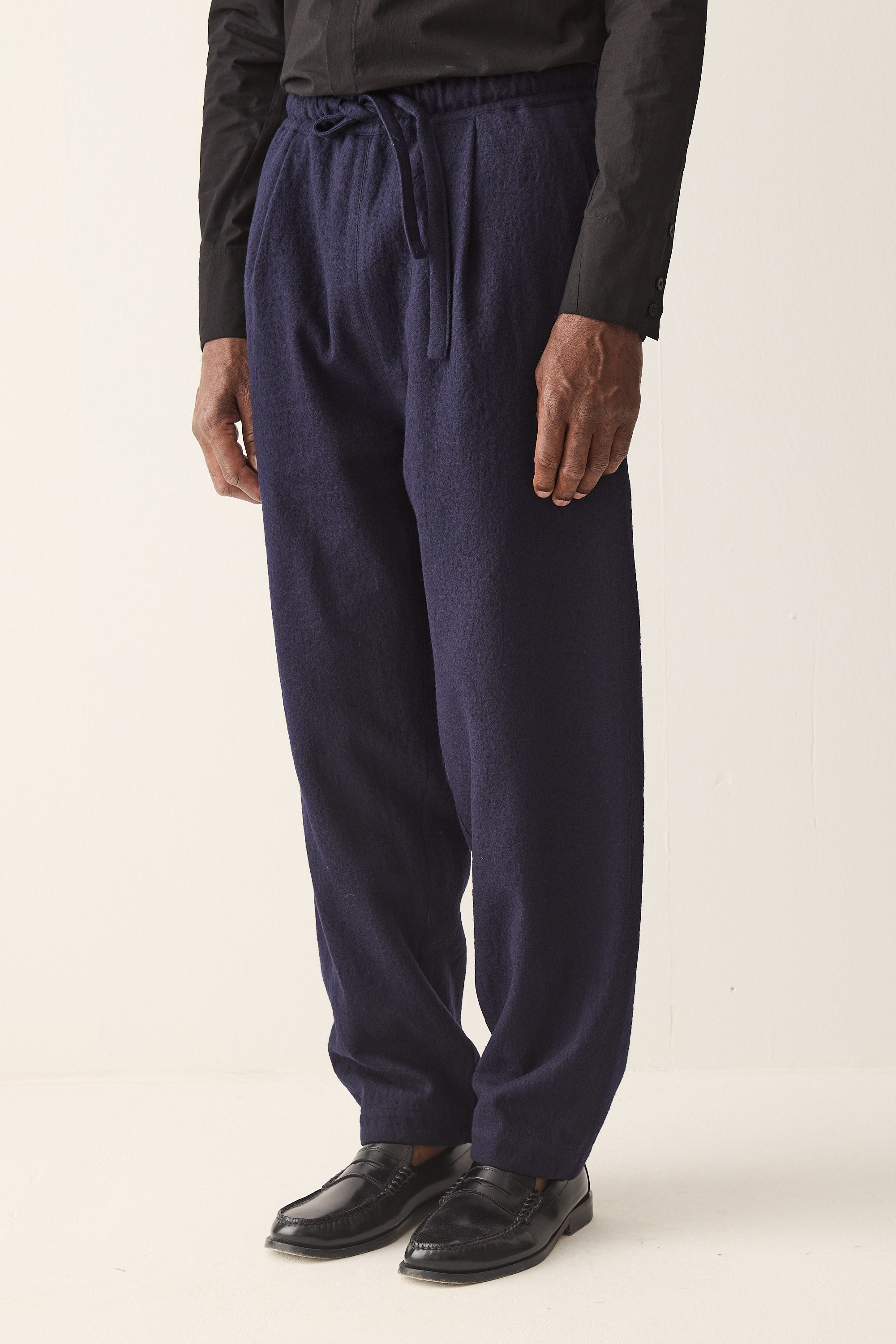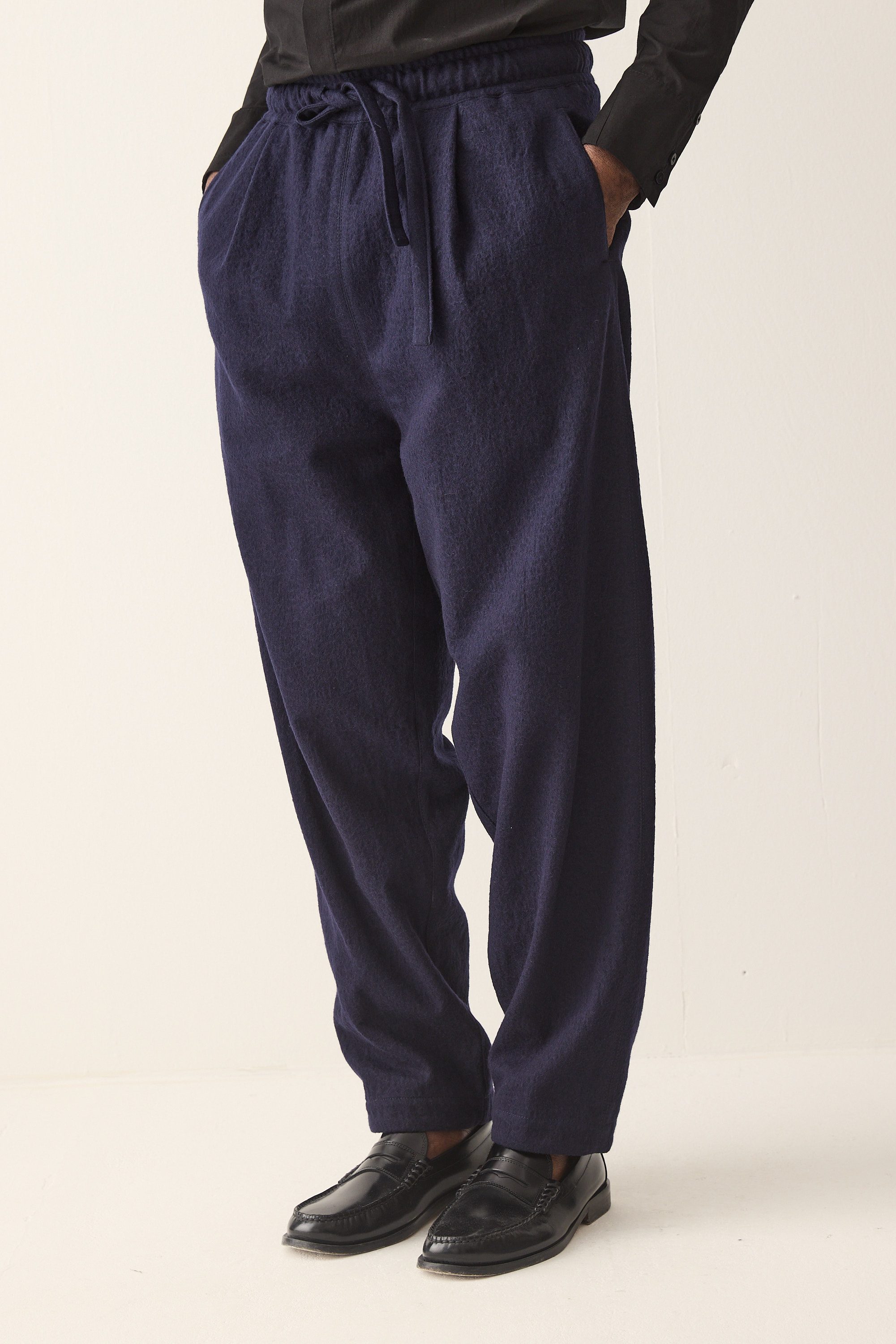 Relaxed fit drawstring trousers, made of a Japanese wool cotton blend