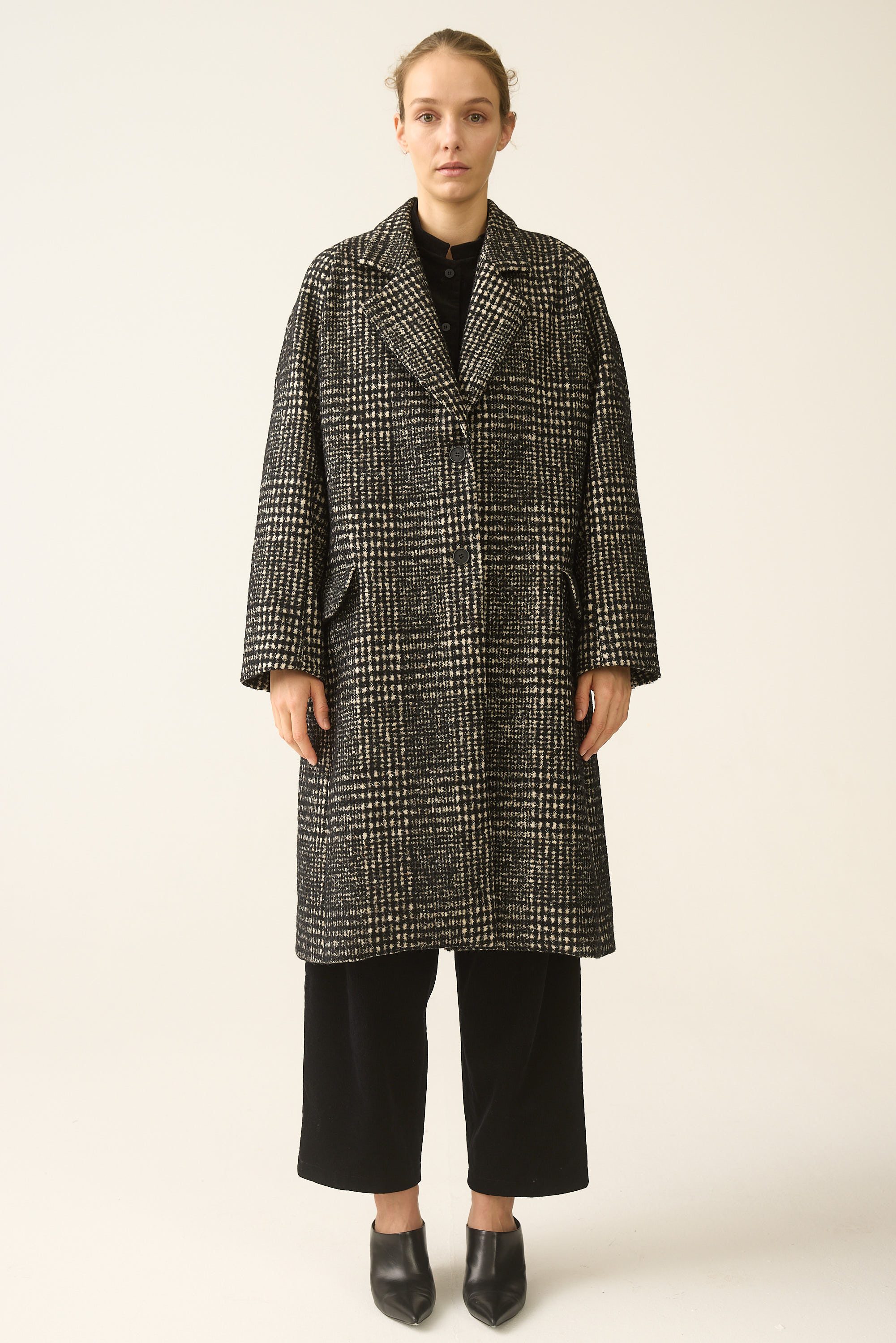 Medium length relaxed fit coat in a virgin wool/cotton blend.