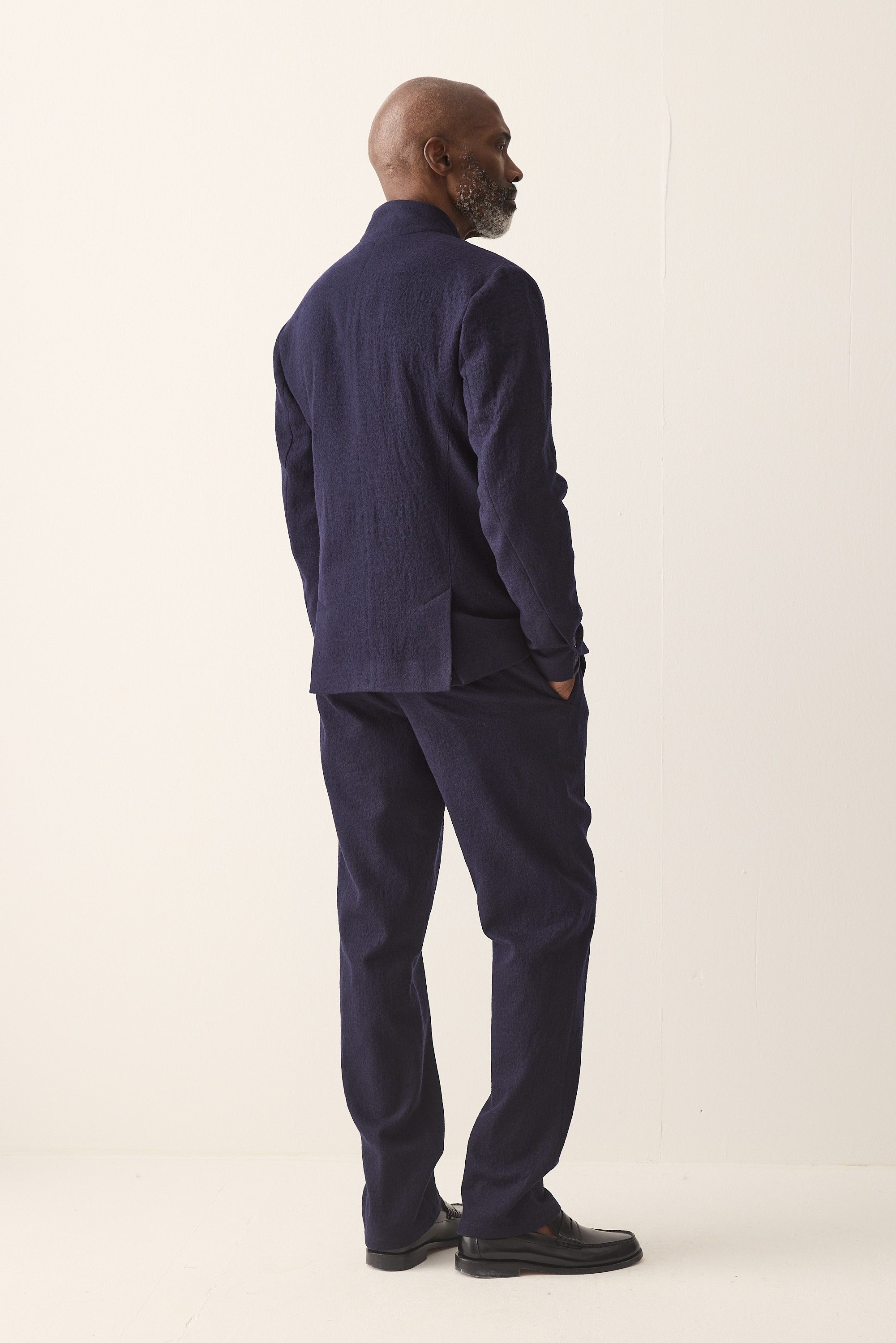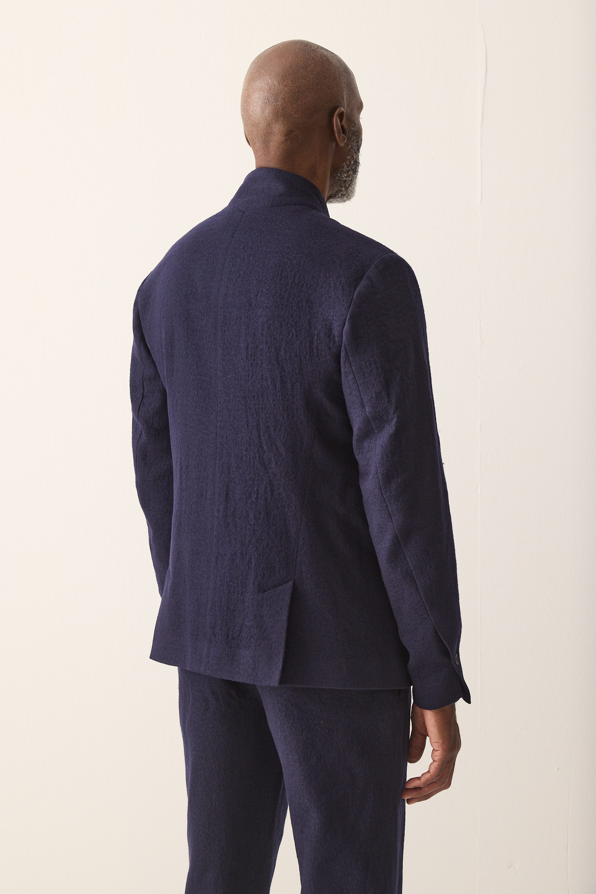 Lapel-less blazer with small stand-up collar, made from a Japanese wool cotton blend