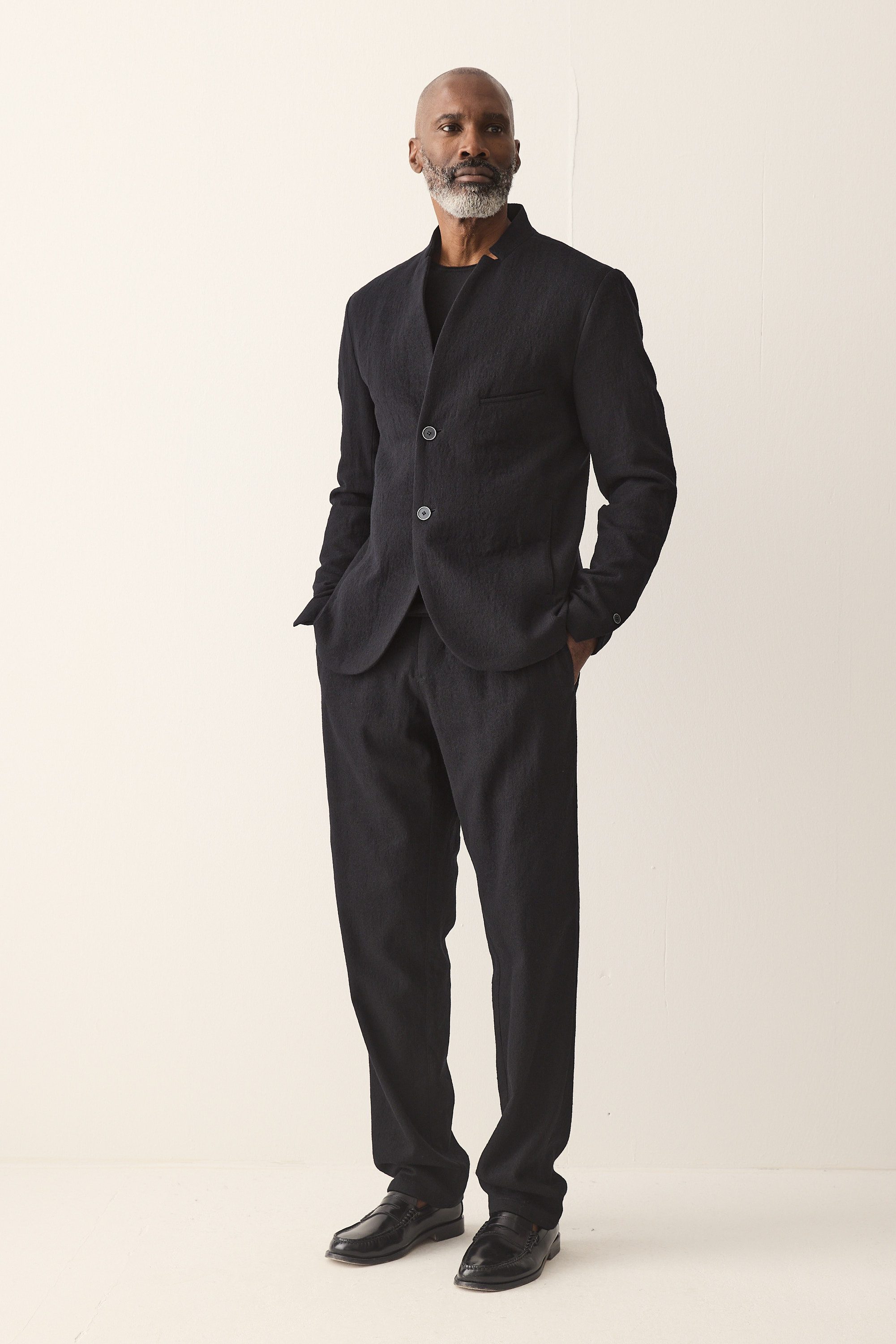 Lapel-less blazer with small stand-up collar, made from a Japanese wool cotton blend