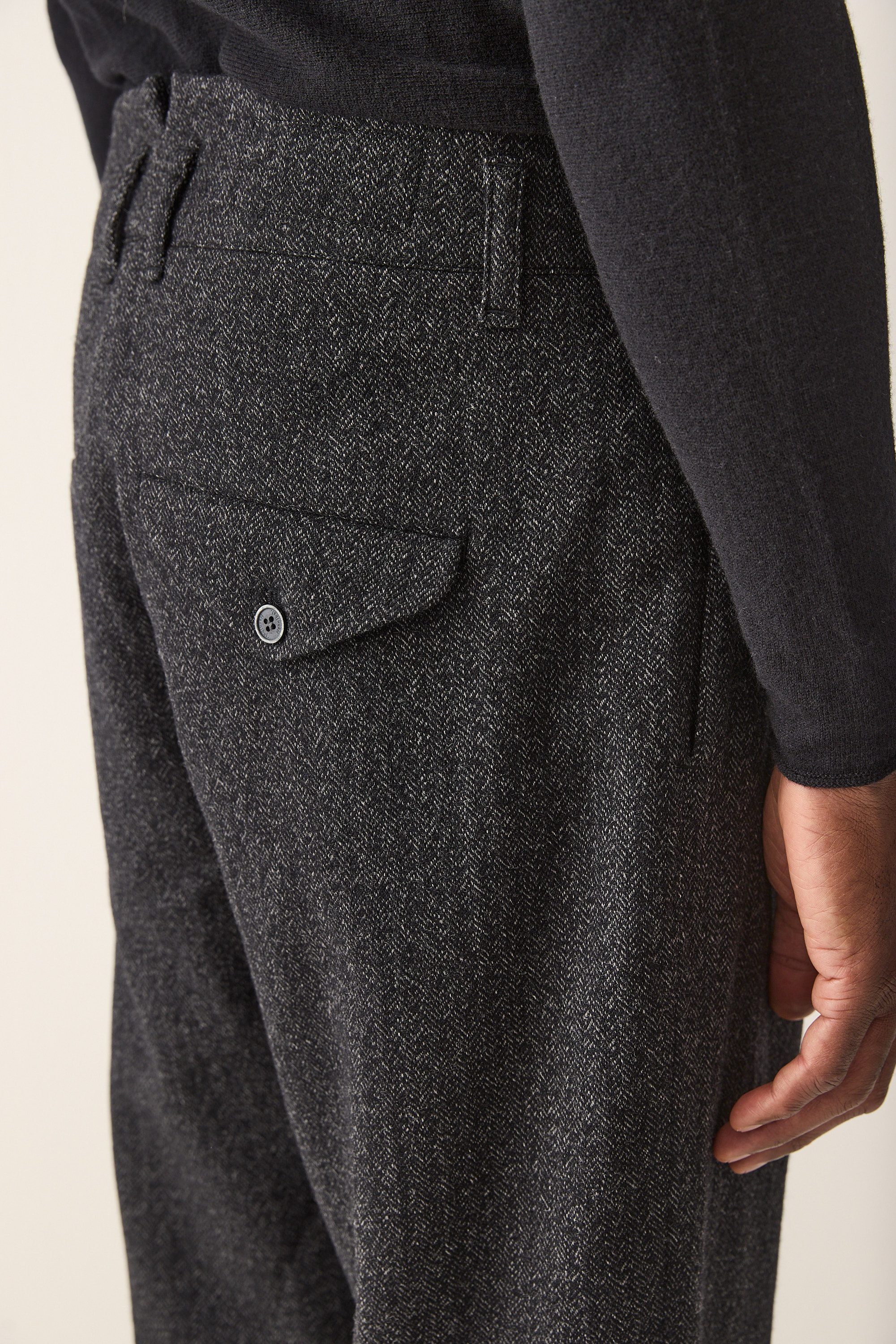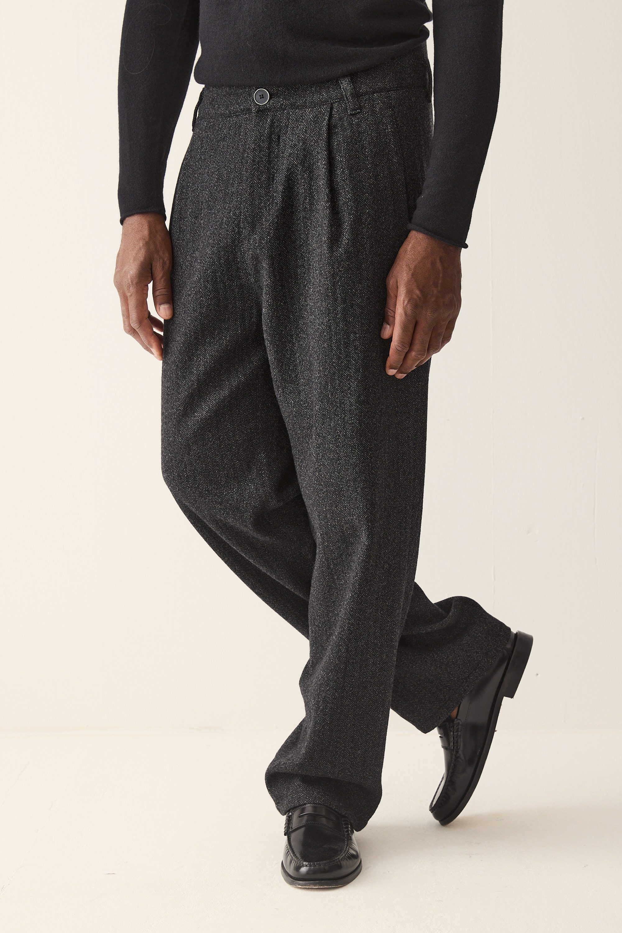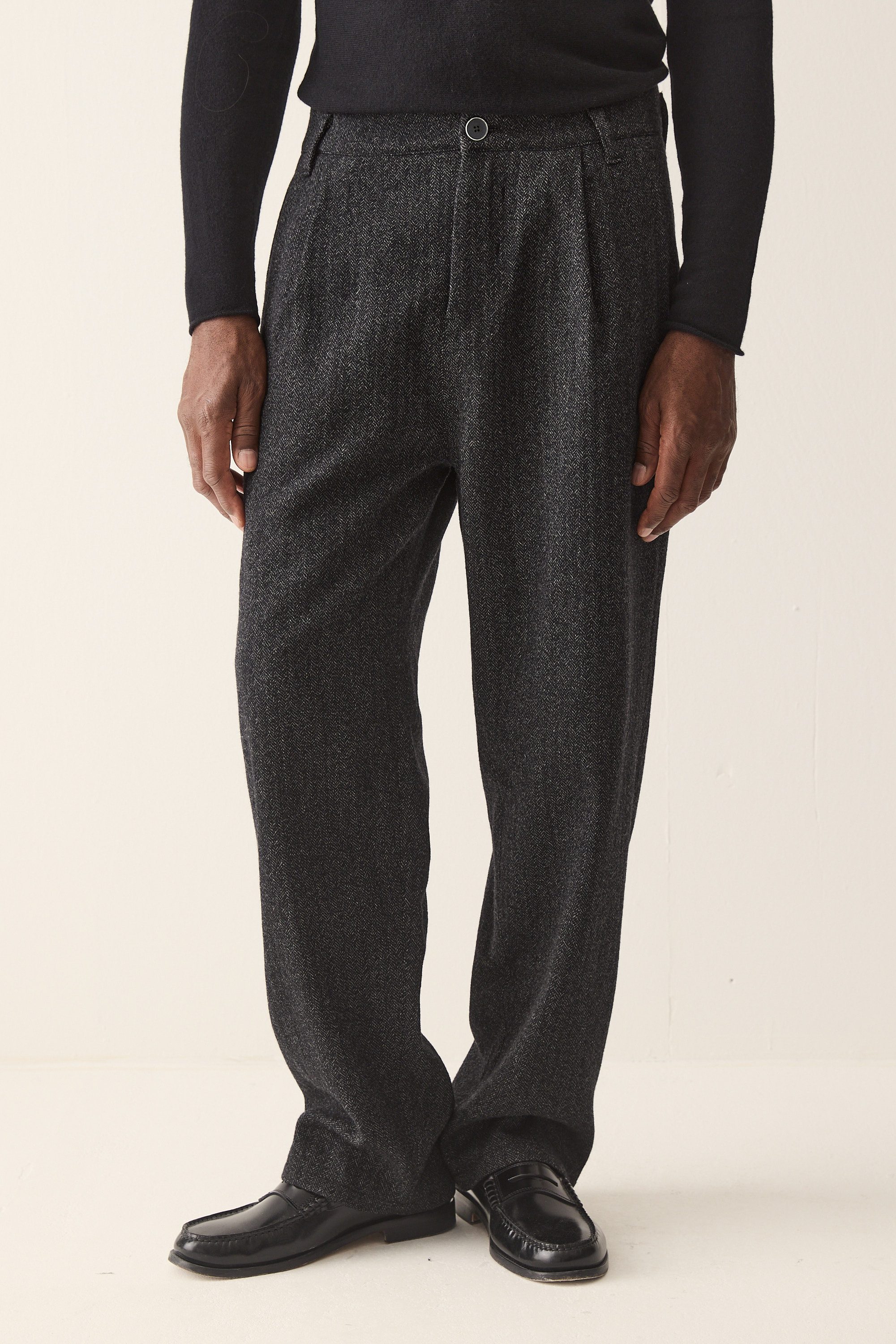 Wide fit single pleated trousers, made from a fine Italian herringbone wool blend.
