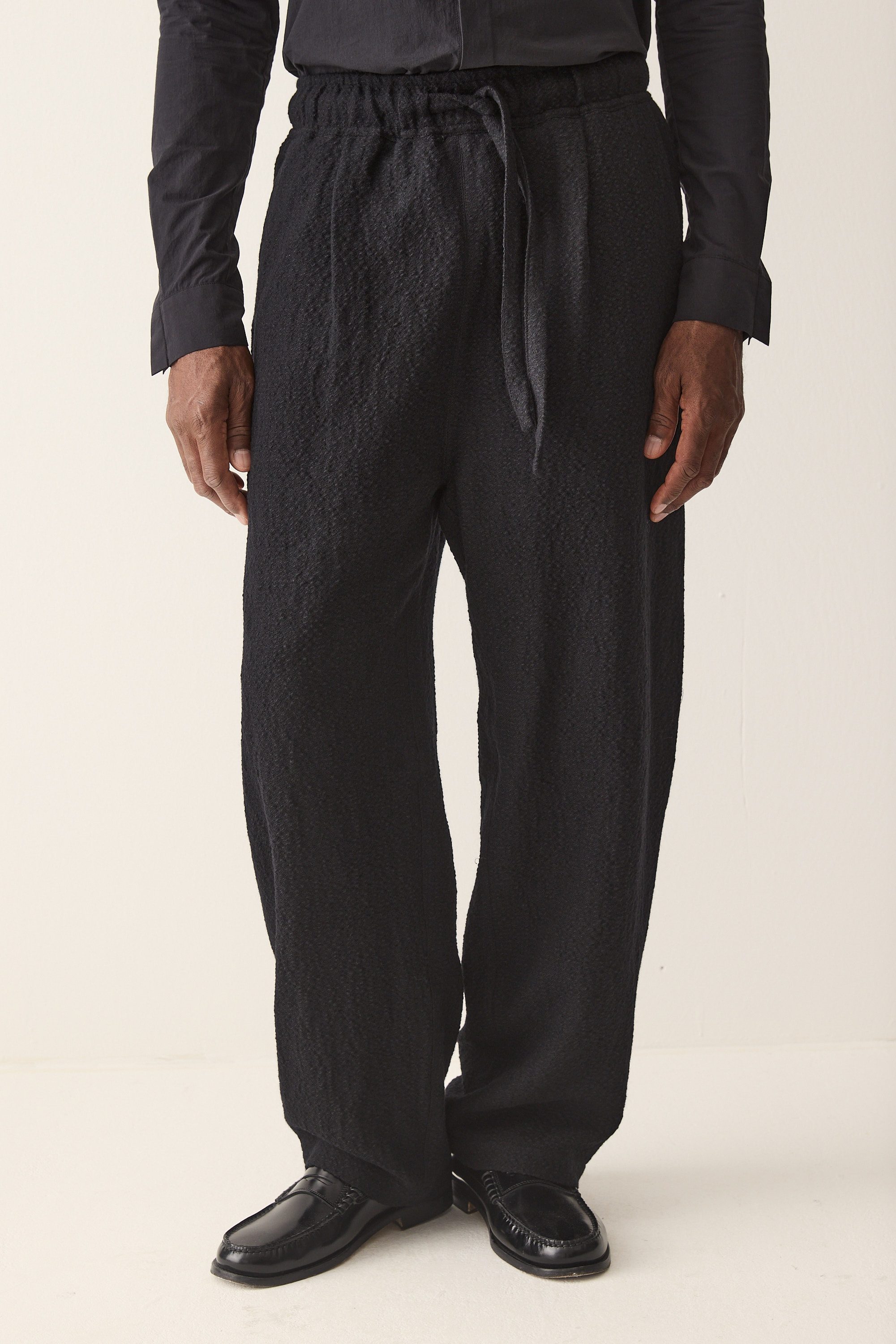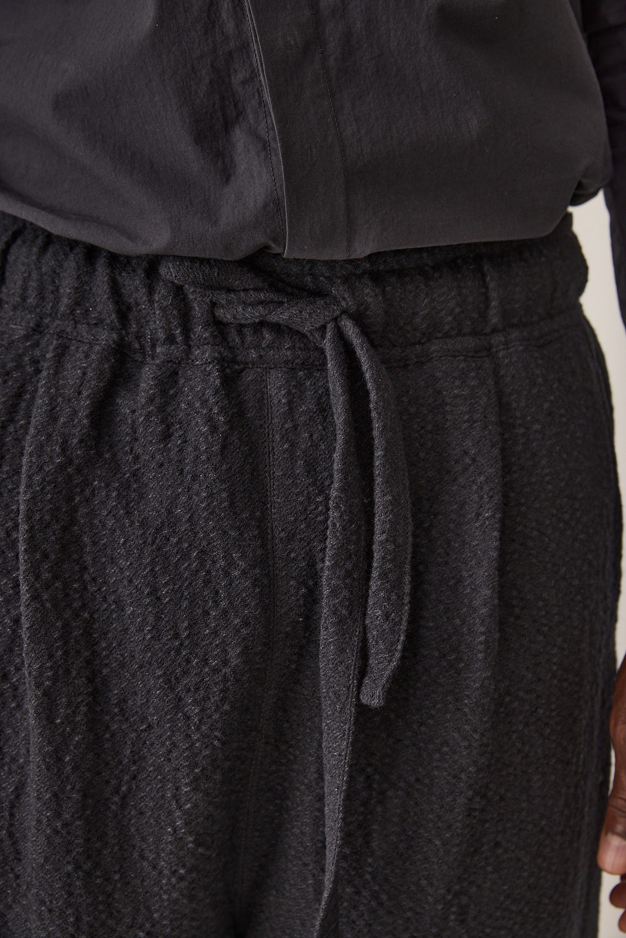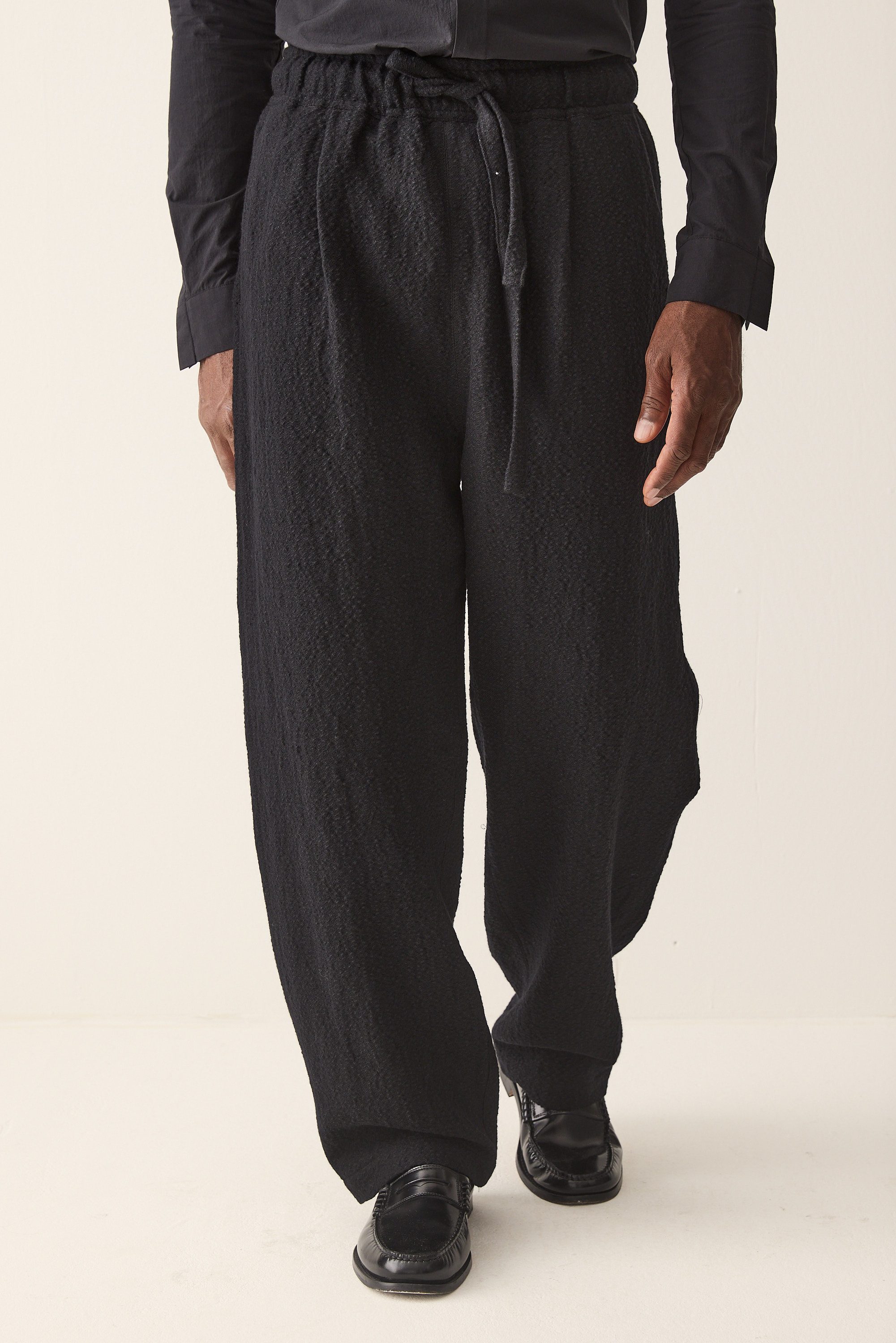 wide fit drawstring trousers, made of a Japanese wool linen cotton blend